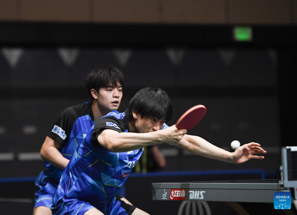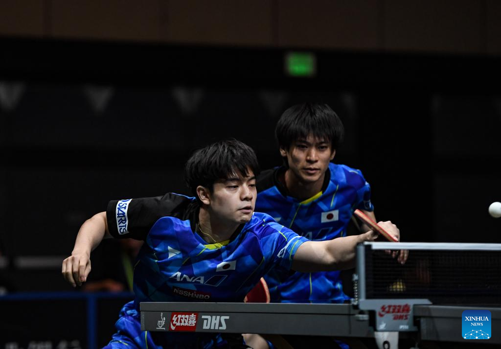 Uda Yukiya/Togami Shunsuke (R) of Japan compete during the first round of men's doubles between Uda Yukiya/Togami Shunsuke of Japan and Marcos Madrid (Mexico)/Jishan Liang (the United States) at 2023 ITTF Table Tennis World Championships Finals in Durban, South Africa, May 20, 2023. (Xinhua/Li Yahui)