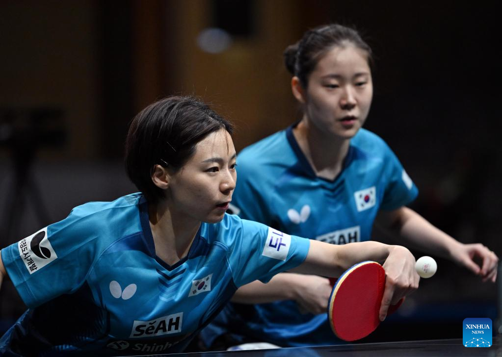 Choi Hyojoo(L)/Lee Zion of South Korea compete against Nina Mittelham/Shan Xiaona of Germany during the women's doubles 1st round match at 2023 ITTF Table Tennis World Championships Finals in Durban, South Africa, May 20, 2023. (Xinhua/Tao Xiyi)