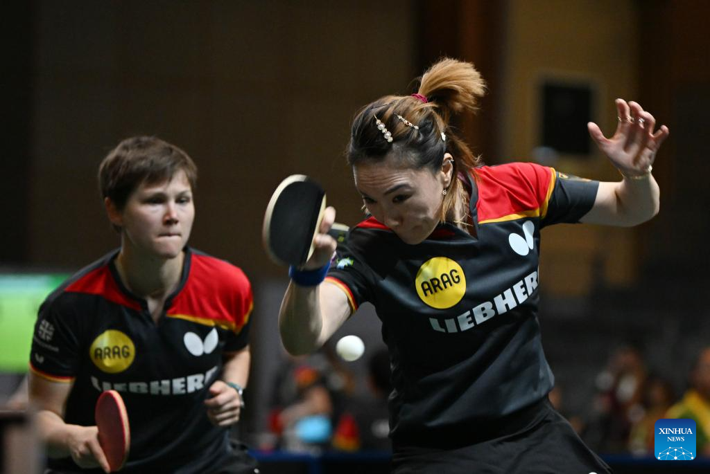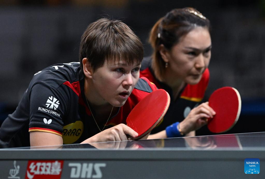 Nina Mittelham/Shan Xiaona (R) of Germany compete against Choi Hyojoo/Lee Zion of South Korea during the women's doubles 1st round match at 2023 ITTF Table Tennis World Championships Finals in Durban, South Africa, May 20, 2023. (Xinhua/Tao Xiyi)