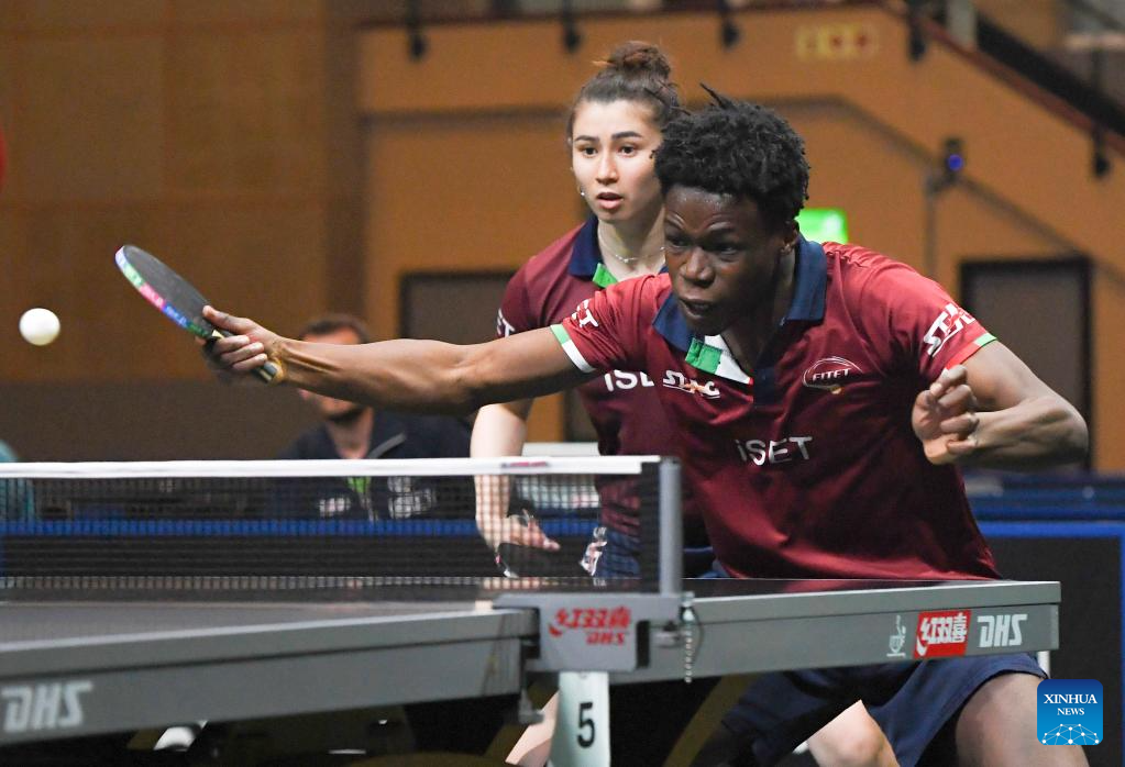 John Oyebode (R)/Gaia Monfardini of Italy compete during the first round of mixed doubles between Wong Chun Ting/Doo Hoi Kem of China's Hong Kong and John Oyebode/Gaia Monfardini of Italy at 2023 ITTF Table Tennis World Championships Finals in Durban, South Africa, May 20, 2023. (Xinhua/Li Yahui)