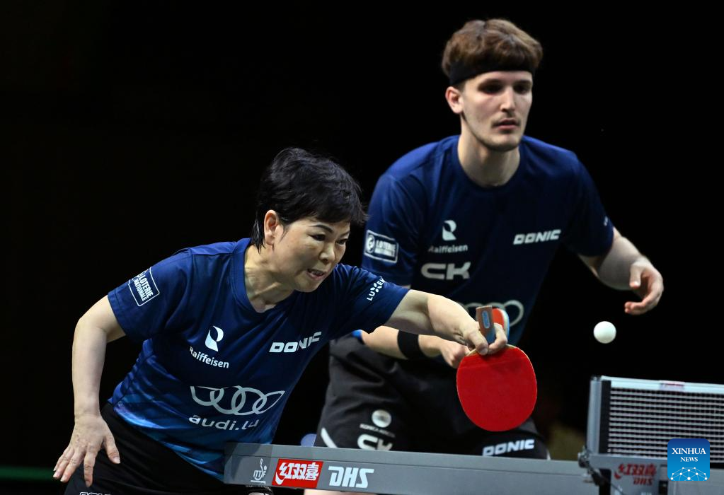 Luka Mladenovic/Ni Xia Lian (L) of Luxembourg compete during the first round of mixed doubles between Luka Mladenovic/Ni Xia Lian of Luxembourg and Sathiyan Gnanasekaran/Manika Batra of India at 2023 ITTF Table Tennis World Championships Finals in Durban, South Africa, May 20, 2023. (Xinhua/Tao Xiyi)