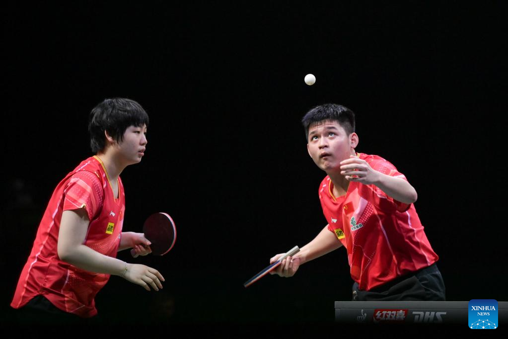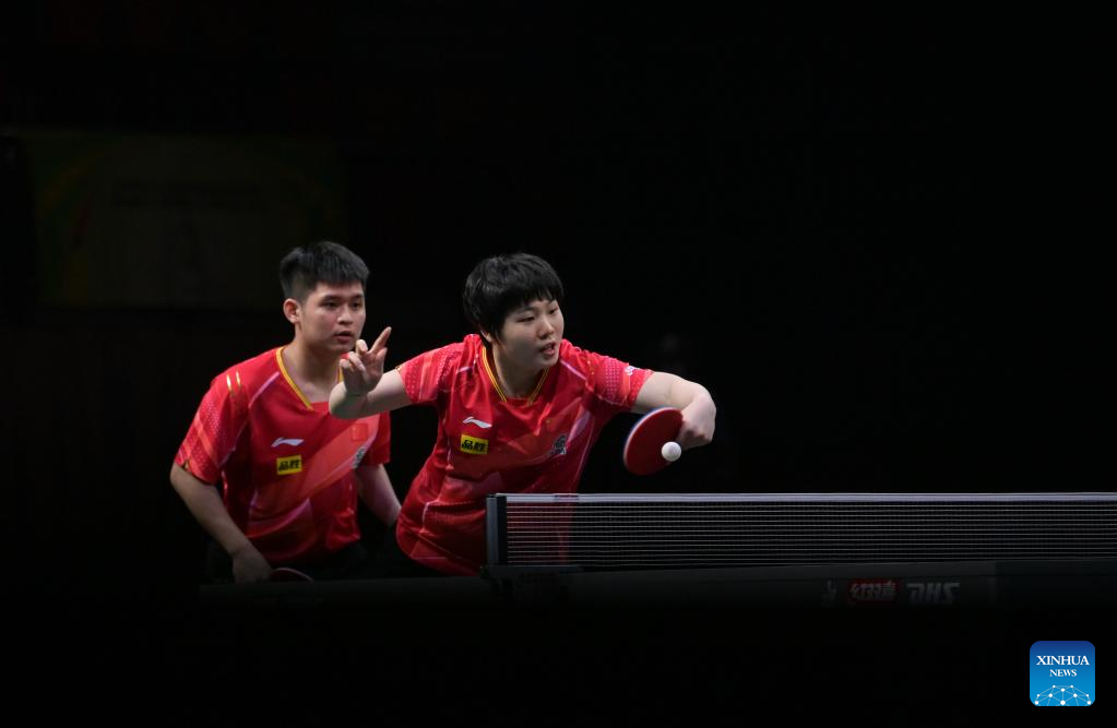 Lin Shidong/Kuai Man (R) of China compete during the first round of mixed doubles between Lin Shidong/Kuai Man of China and Chetan Nathoo/Danisha Patel of South Africa at 2023 ITTF Table Tennis World Championships Finals in Durban, South Africa, May 20, 2023. (Xinhua/Han Xu)