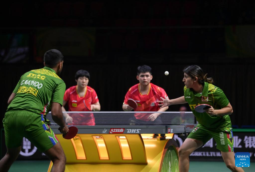Lin Shidong (R)/Kuai Man of China compete during the first round of mixed doubles between Lin Shidong/Kuai Man of China and Chetan Nathoo/Danisha Patel of South Africa at 2023 ITTF Table Tennis World Championships Finals in Durban, South Africa, May 20, 2023. (Xinhua/Han Xu)