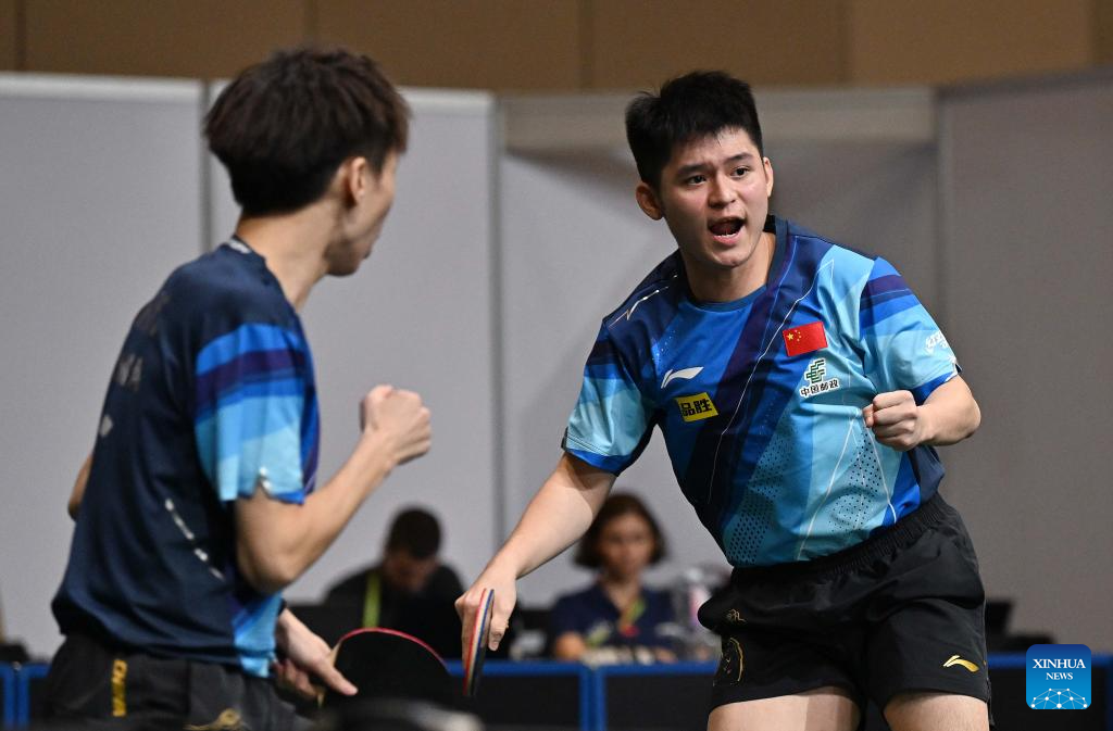 Lin Gaoyuan/Lin Shidong (R) of China celebrate scoring as competing against Harimoto Tomokazu/Yoshimura Maharu of Japan during the men's doubles first round match at 2023 ITTF Table Tennis World Championships Finals in Durban, South Africa, May 21, 2023. (Xinhua/Tao Xiyi)