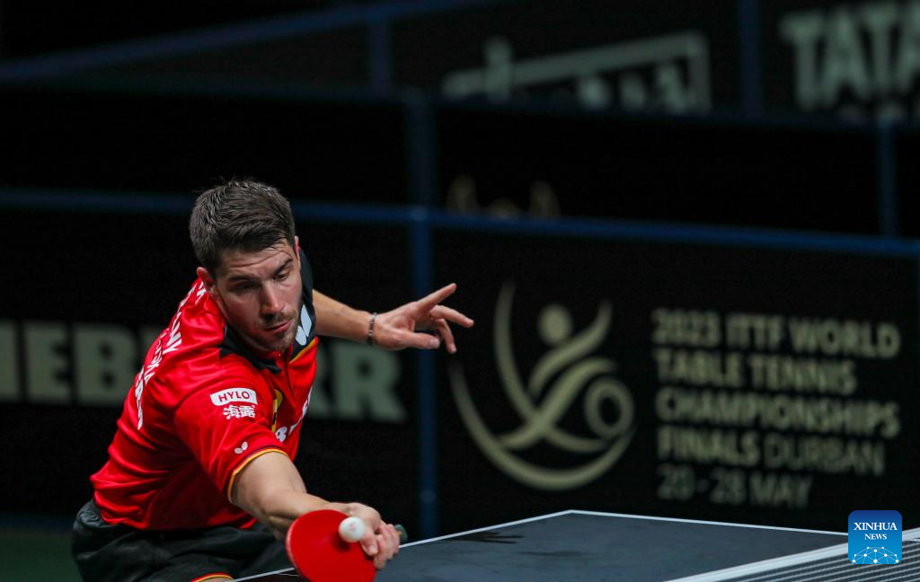 Patrick Franziska of Germany hits a return against Cedric Nuytinck of Belgium during the men's singles 1st round match at 2023 ITTF Table Tennis World Championships Finals in Durban, South Africa, May 21, 2023. (Xinhua/Zhang Yudong)