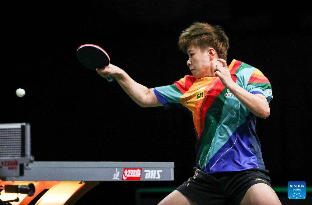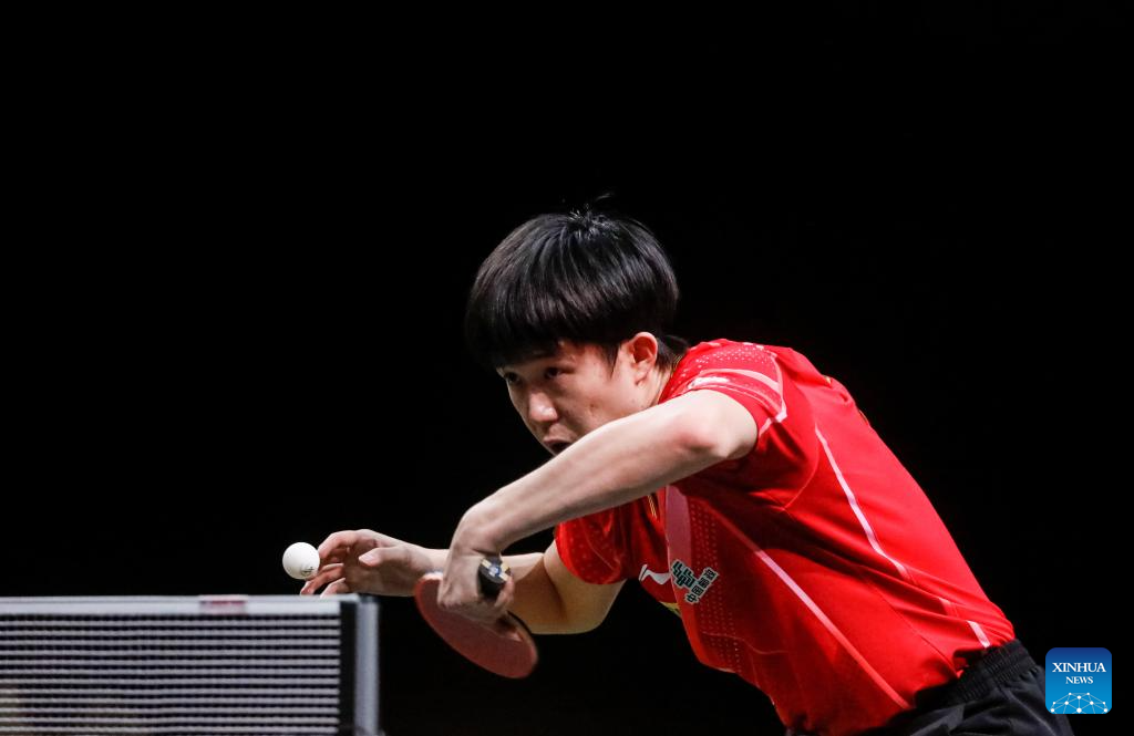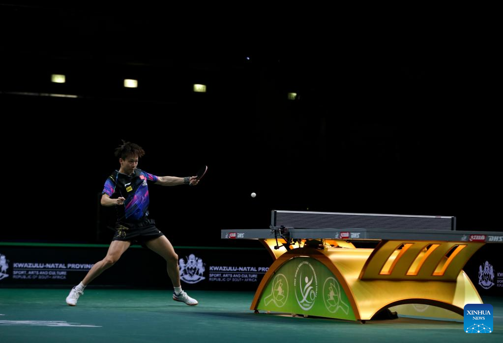Wang Yidi of China hits a return during the women's singles first round match between Wang Yidi of China and Mateja Jeger of Croatia at 2023 ITTF Table Tennis World Championships Finals in Durban, South Africa, May 21, 2023. (Xinhua/Han Xu)