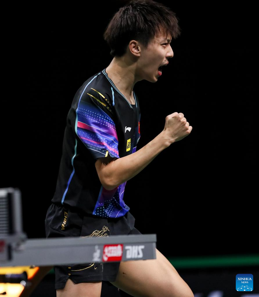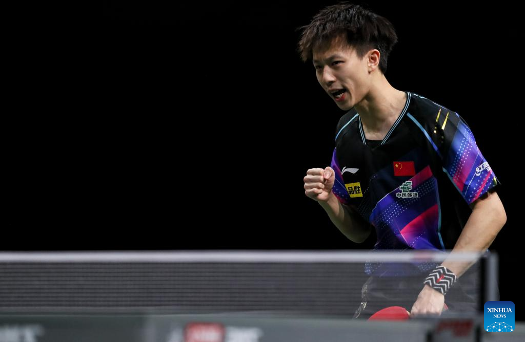 Lin Gaoyuan of China celebrates during the men's singles first round match between Lin Gaoyuan of China and Jakub Dyjas of Poland at 2023 ITTF Table Tennis World Championships Finals in Durban, South Africa, May 21, 2023. (Xinhua/Zhang Yudong)