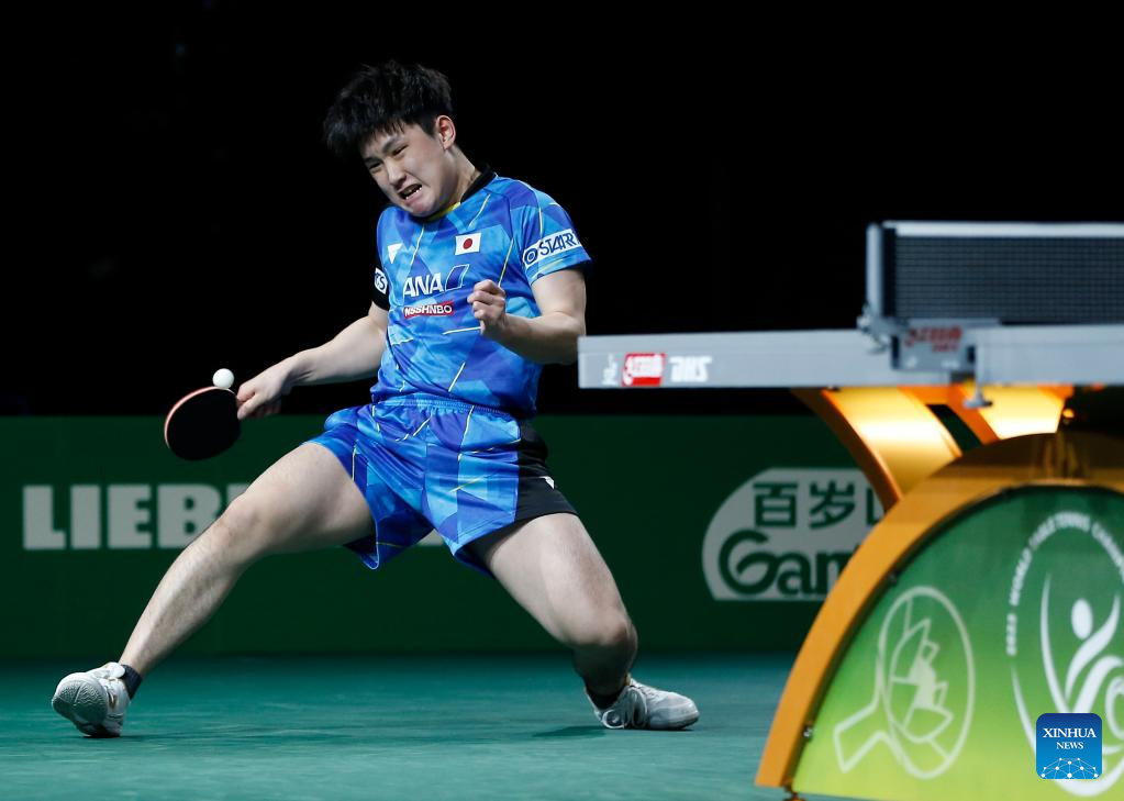 Harimoto Tomokazu of Japan hits a return during the men's singles first round match between Harimoto Tomokazu of Japan and Chew Zhe Yu Clarence of Singapore at 2023 ITTF Table Tennis World Championships Finals in Durban, South Africa, May 21, 2023. (Xinhua/Tao Xiyi)