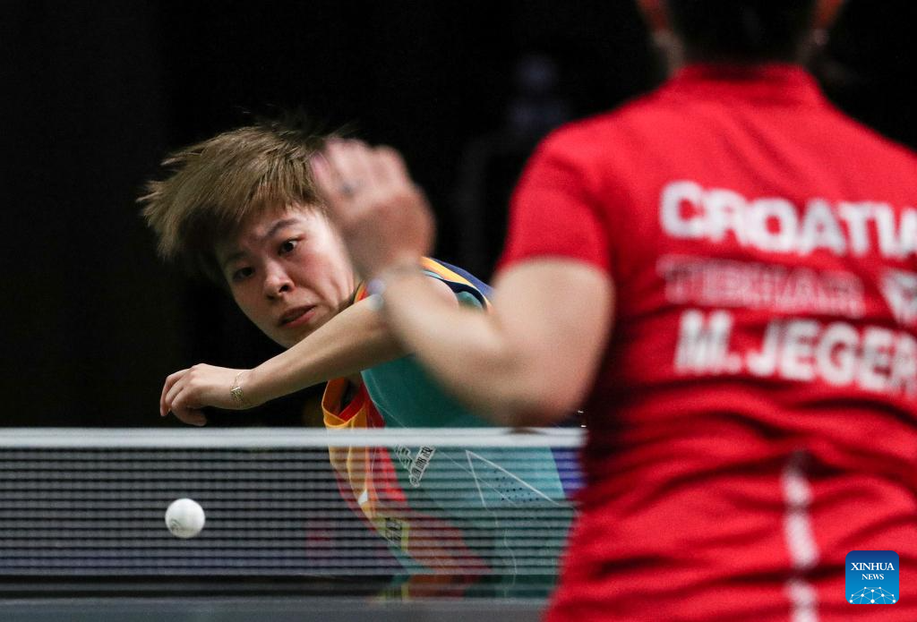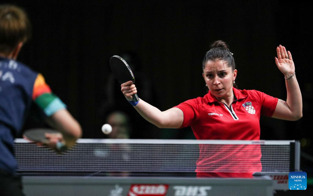 Mateja Jeger of Croatia hits a return during the women's singles first round match between Wang Yidi of China and Mateja Jeger of Croatia at 2023 ITTF Table Tennis World Championships Finals in Durban, South Africa, May 21, 2023. (Xinhua/Han Xu)