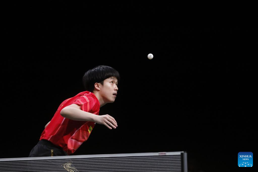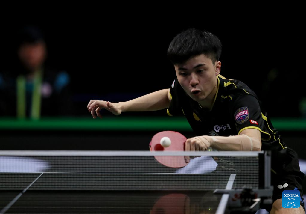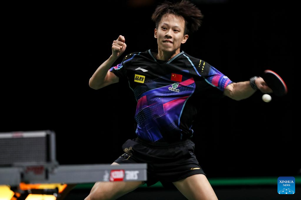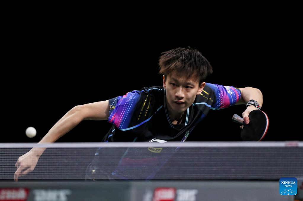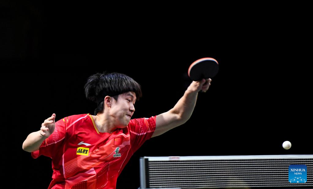 Lin Gaoyuan of China hits a return during the men's singles first round match between Lin Gaoyuan of China and Jakub Dyjas of Poland at 2023 ITTF Table Tennis World Championships Finals in Durban, South Africa, May 21, 2023. (Xinhua/Zhang Yudong)