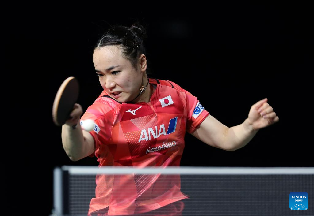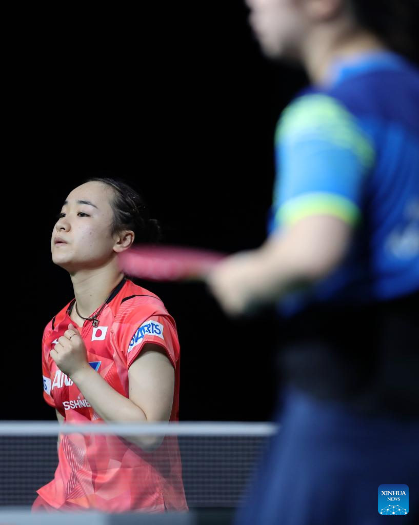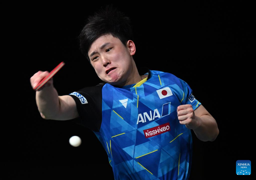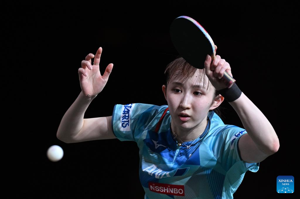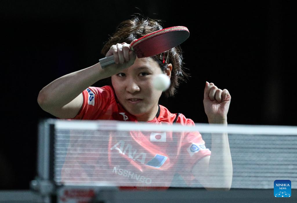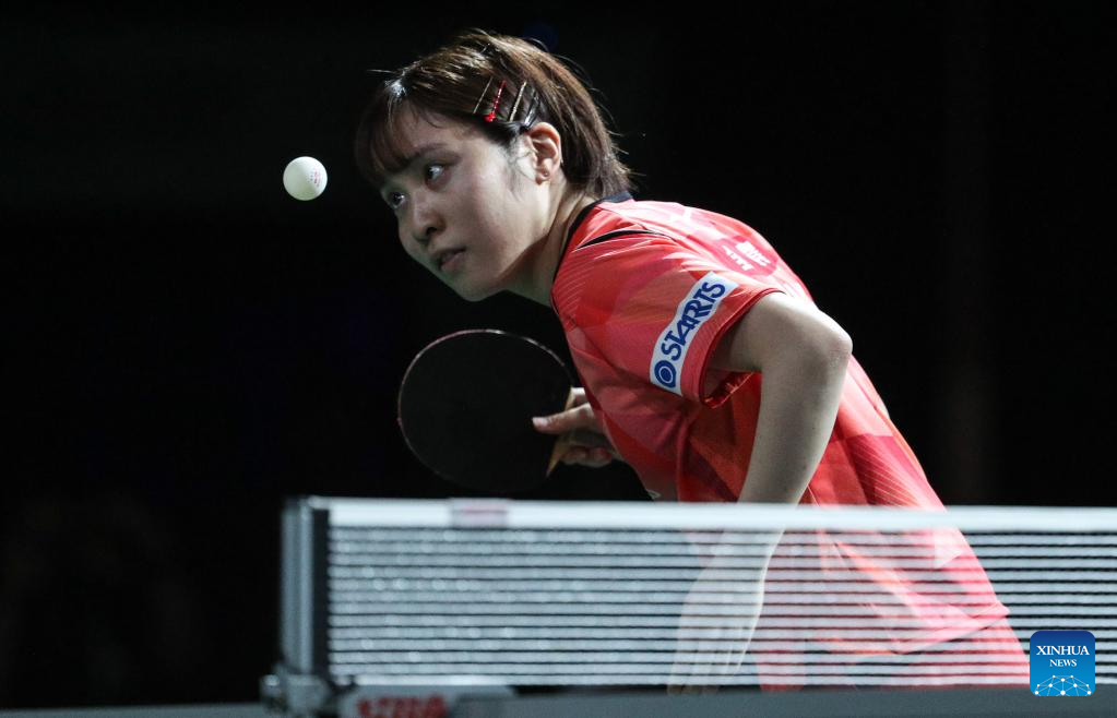 Ito Mima of Japan hits a return during the women's singles first round match between Ito Mima of Japan and Zauresh Akashewa of Kazakhstan at 2023 ITTF Table Tennis World Championships Finals in Durban, South Africa, May 21, 2023. (Xinhua/Wang Dongzhen)