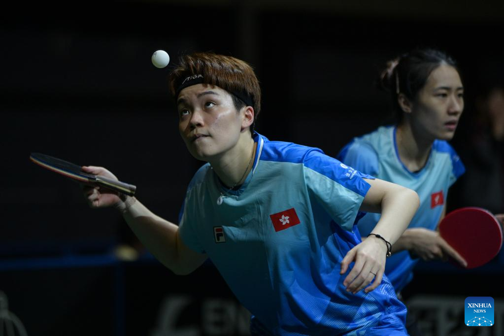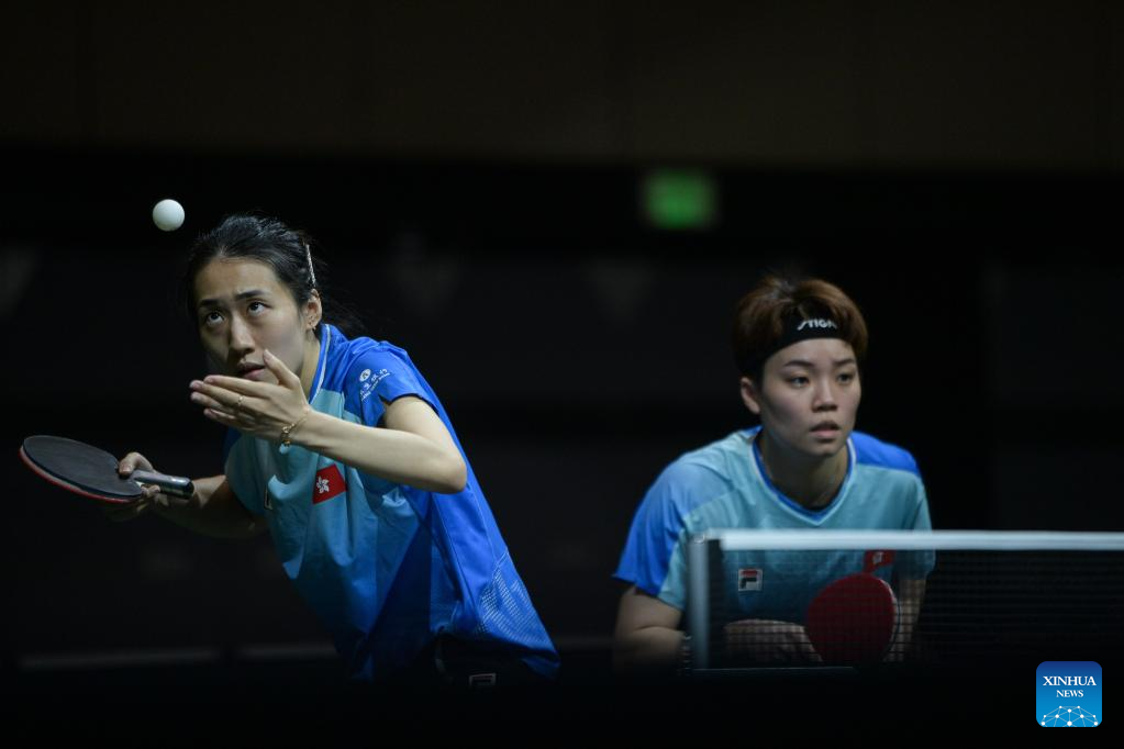 Doo Hoi Kem (L)/Zhu Chengzhu of China's Hong Kong compete during the women's doubles first round match between Doo Hoi Kem/Zhu Chengzhu of China's Hong Kong and Hana Goda/Alaa Yehia of Egypt at 2023 ITTF Table Tennis World Championships Finals in Durban, South Africa, May 21, 2023. (Xinhua/Han Xu)