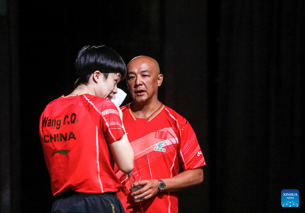 Wang Chuqin (L) of China talks to Coach Xiao Zhan during the men's singles first round match between Wang Chuqin of China and Ocean Belrose of French Polynesia at 2023 ITTF Table Tennis World Championships Finals in Durban, South Africa, May 21, 2023. (Xinhua/Li Yahui)