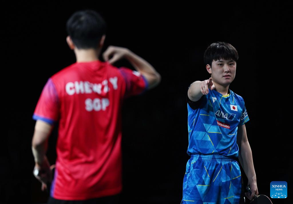 Harimoto Tomokazu (R) of Japan reacts during the men's singles first round match between Harimoto Tomokazu of Japan and Chew Zhe Yu Clarence of Singapore at 2023 ITTF Table Tennis World Championships Finals in Durban, South Africa, May 21, 2023. (Xinhua/Tao Xiyi)