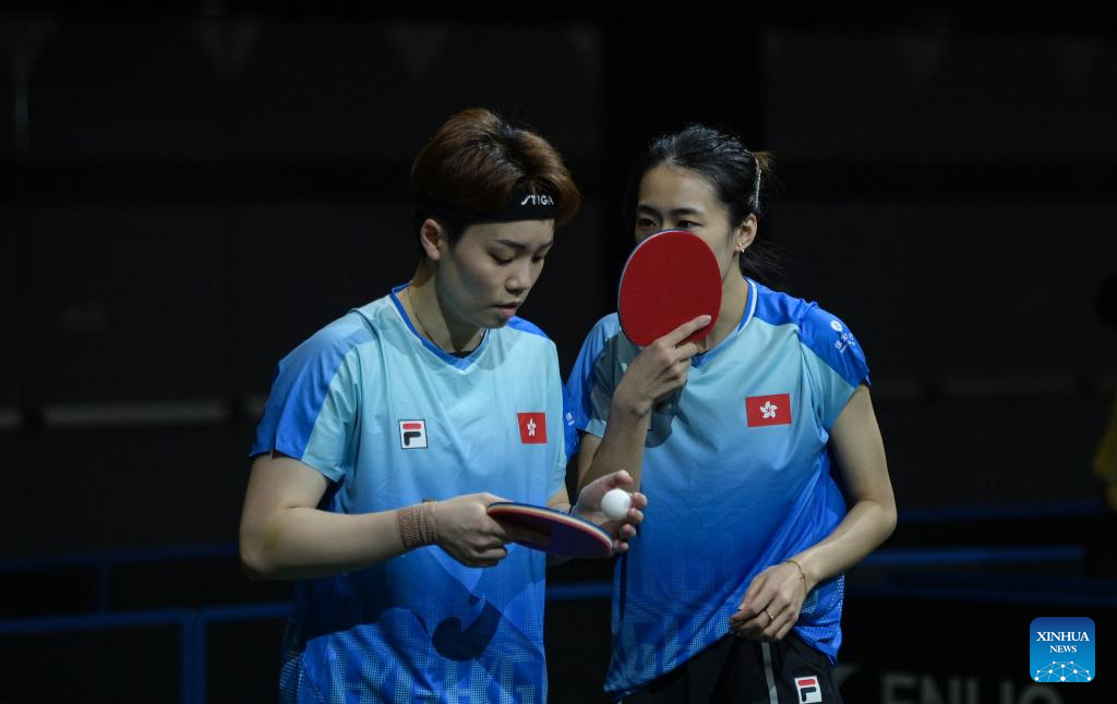 Doo Hoi Kem (L)/Zhu Chengzhu of China's Hong Kong communicate during the women's doubles first round match between Doo Hoi Kem/Zhu Chengzhu of China's Hong Kong and Hana Goda/Alaa Yehia of Egypt at 2023 ITTF Table Tennis World Championships Finals in Durban, South Africa, May 21, 2023. (Xinhua/Han Xu)