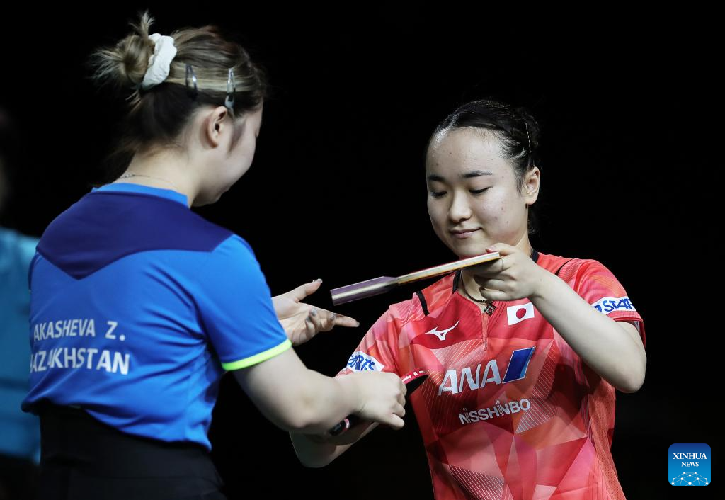 Ito Mima (R) of Japan and Zauresh Akashewa of Kazakhstan check racket for each other prior to the women's singles first round match at 2023 ITTF Table Tennis World Championships Finals in Durban, South Africa, May 21, 2023. (Xinhua/Wang Dongzhen)