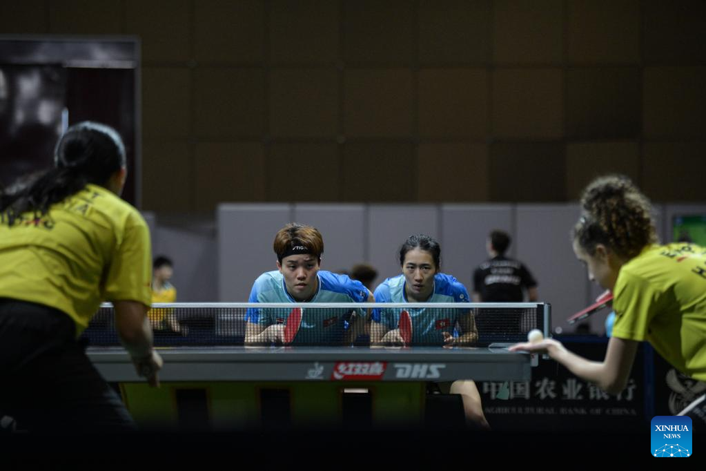 Doo Hoi Kem (R)/Zhu Chengzhu of China's Hong Kong compete during the women's doubles first round match between Doo Hoi Kem/Zhu Chengzhu of China's Hong Kong and Hana Goda/Alaa Yehia of Egypt at 2023 ITTF Table Tennis World Championships Finals in Durban, South Africa, May 21, 2023. (Xinhua/Han Xu)