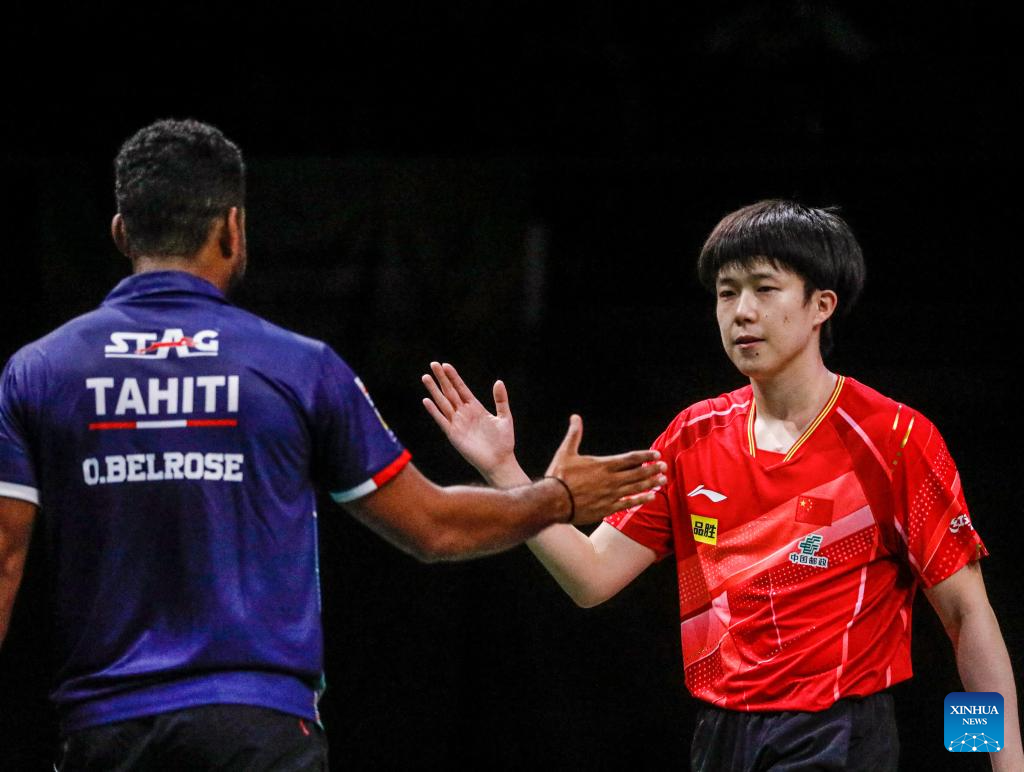 Wang Chuqin (R) of China greets Ocean Belrose of French Polynesia after the men's singles first round match at 2023 ITTF Table Tennis World Championships Finals in Durban, South Africa, May 21, 2023. (Xinhua/Li Yahui)