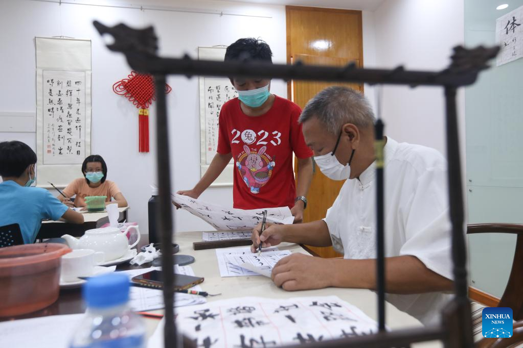 An instructor checks the students' calligraphy works at the China Cultural Center in Yangon, Myanmar, May 23, 2023. Some students in Myanmar have spent much of the summer vacation learning Chinese calligraphy at the China Cultural Center in Yangon.(Photo by Myo Kyaw Soe/Xinhua)
