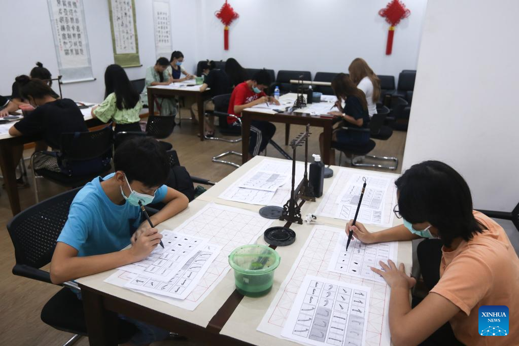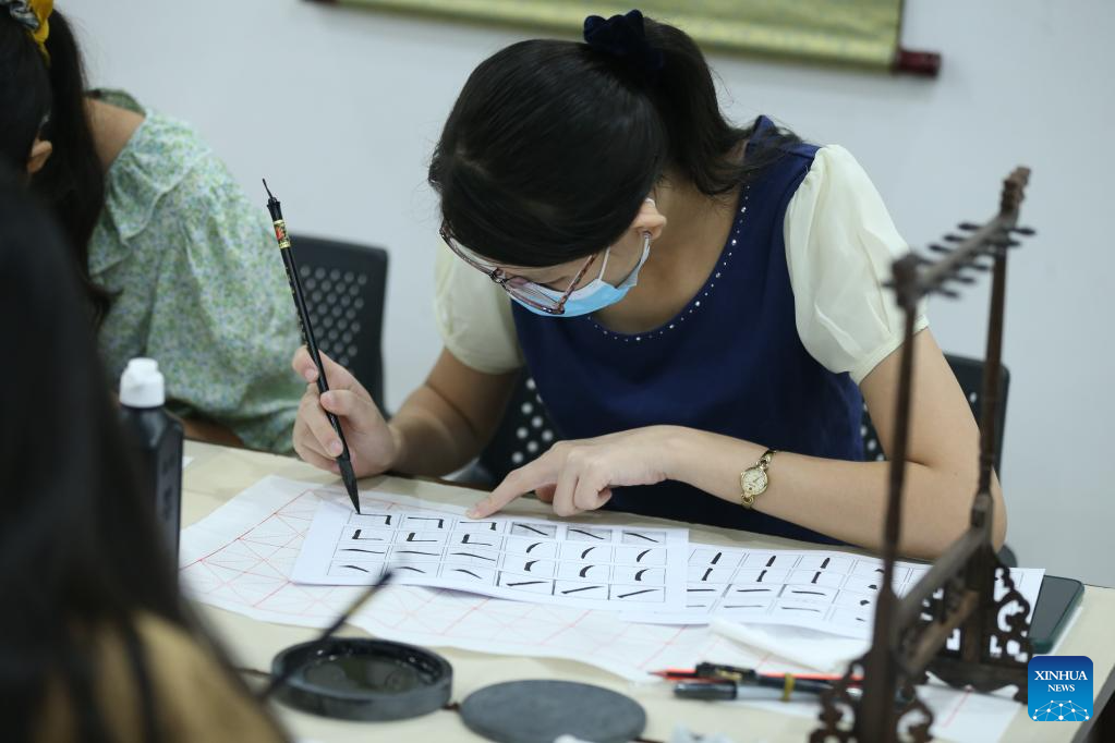 Myanmar students practice Chinese calligraphy at the China Cultural Center in Yangon, Myanmar, May 23, 2023. Some students in Myanmar have spent much of the summer vacation learning Chinese calligraphy at the China Cultural Center in Yangon.(Photo by Myo Kyaw Soe/Xinhua)