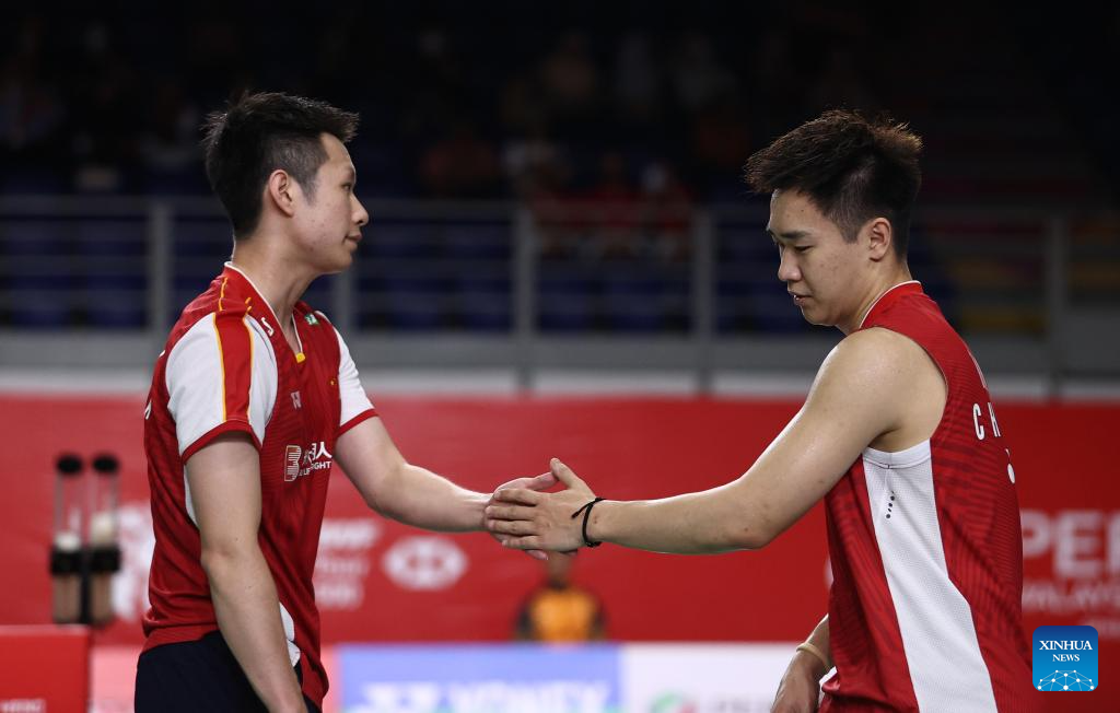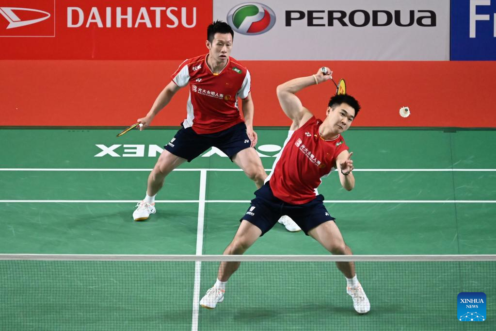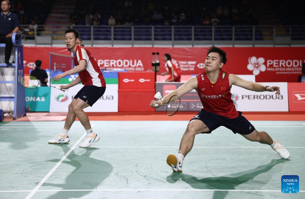 China's Ren Xiangyu/Tan Qiang (R) compete during the men's doubles round of 32 match against Malaysia's Ong Yew Sin/Teo Ee Yi at Malaysia Masters 2023 in Kuala Lumpur, Malaysia, May 23, 2023. (Photo by Wong Fok Loy/Xinhua)