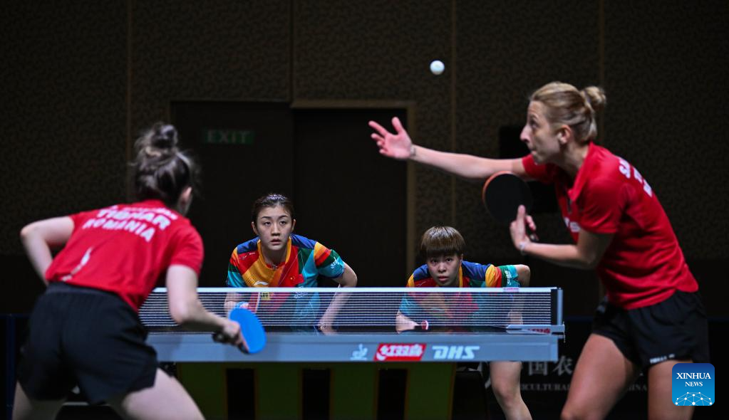 Chen Meng (2nd L)/Wang Yidi (2nd R) of China compete during the women's doubles round of 16 match against Andreea Dragoman(1st L)/Elizabeta Samara of Romania at 2023 ITTF Table Tennis World Championships Finals in Durban, South Africa, May 24, 2023. (Xinhua/Tao Xiyi)
