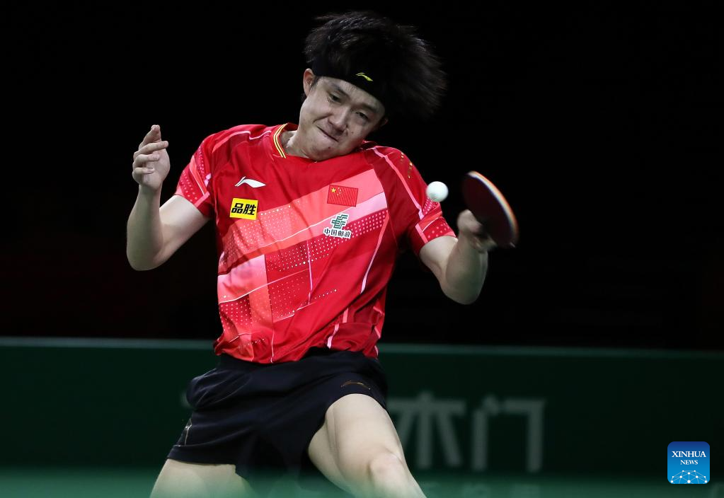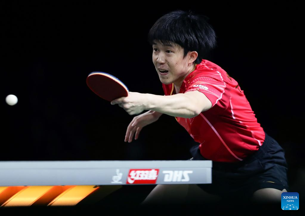 Wang Chuqin of China hits a return during the men's round of 32 match against Uda Yukiya of Japan at 2023 ITTF Table Tennis World Championships Finals in Durban, South Africa, May 24, 2023. (Xinhua/Wang Dongzhen)