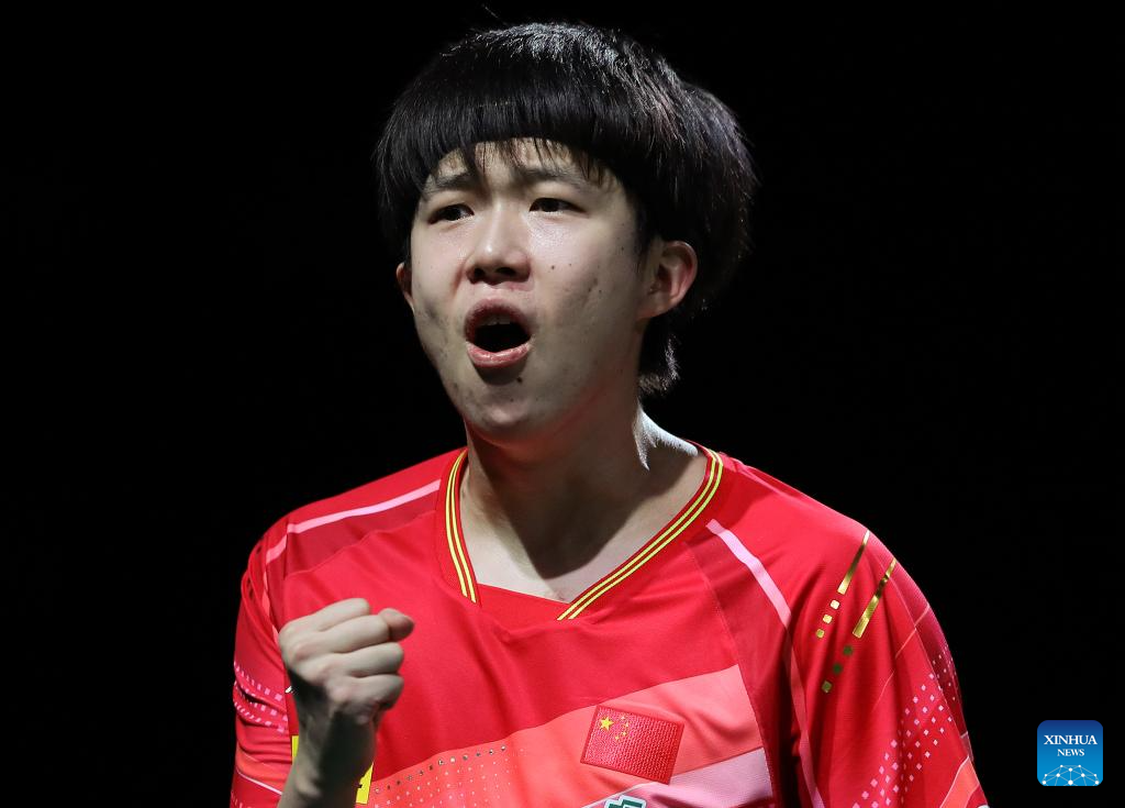Wang Chuqin of China celebrates during the men's round of 32 match against Uda Yukiya of Japan at 2023 ITTF Table Tennis World Championships Finals in Durban, South Africa, May 24, 2023. (Xinhua/Wang Dongzhen)