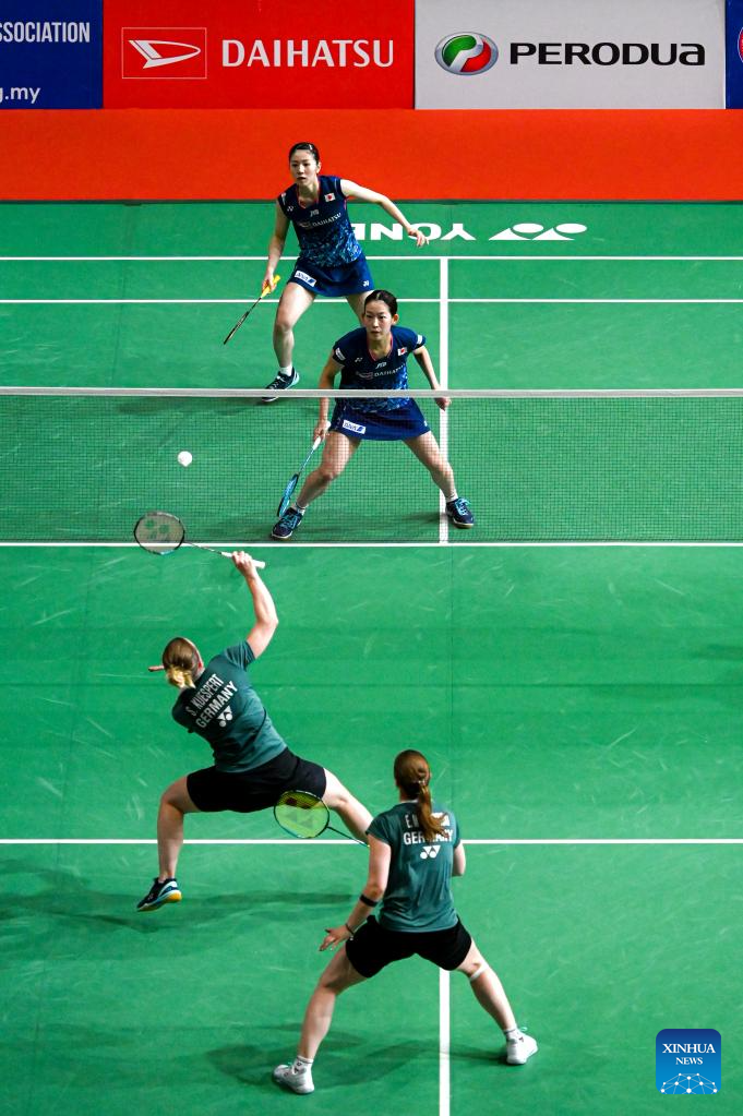 Matsuyama Nami/Shida Chiharu(Top) of Japan and Stine Kuespert(L)/Emma Moszczynski(Bottom) of Germany compete during the women's doubles round of 32 match at Malaysia Masters 2023 in Kuala Lumpur, Malaysia, May 24, 2023. (Photo by Gan Chuan Choon/Xinhua)