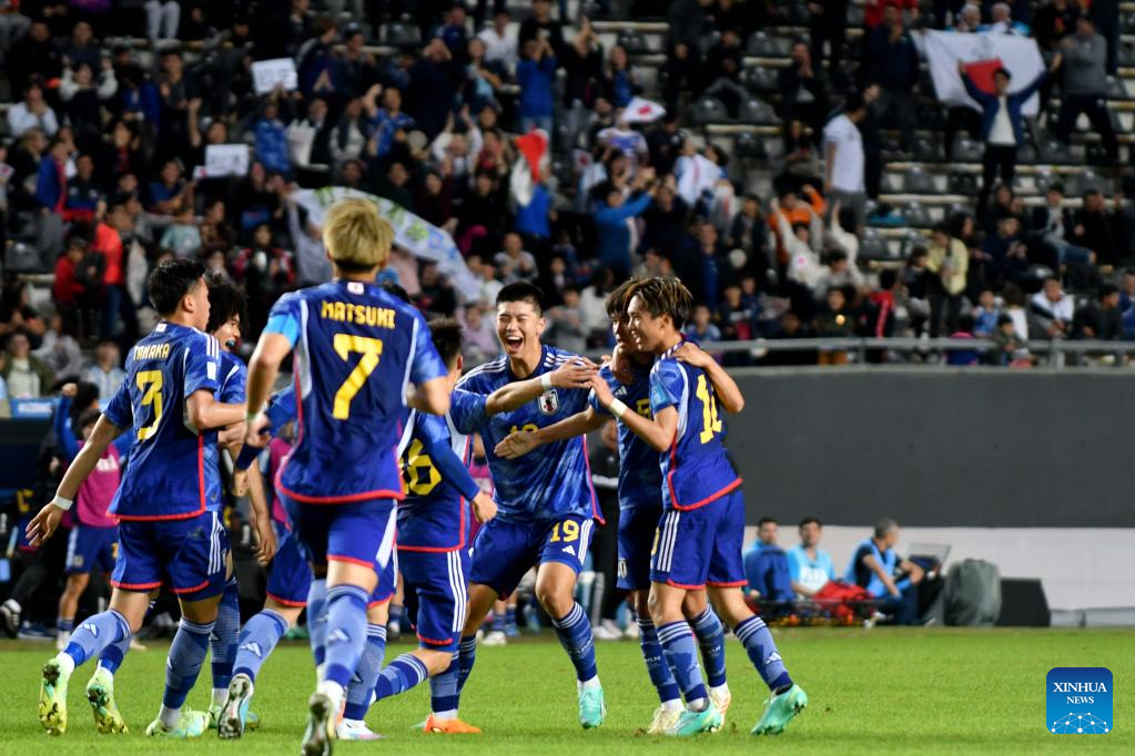 Players of Japan celebrate their goal during the FIFA U20 World Cup group C match between Japan and Colombia in La Plata, Argentina, May 24, 2023. (TELAM/Handout via Xinhua)