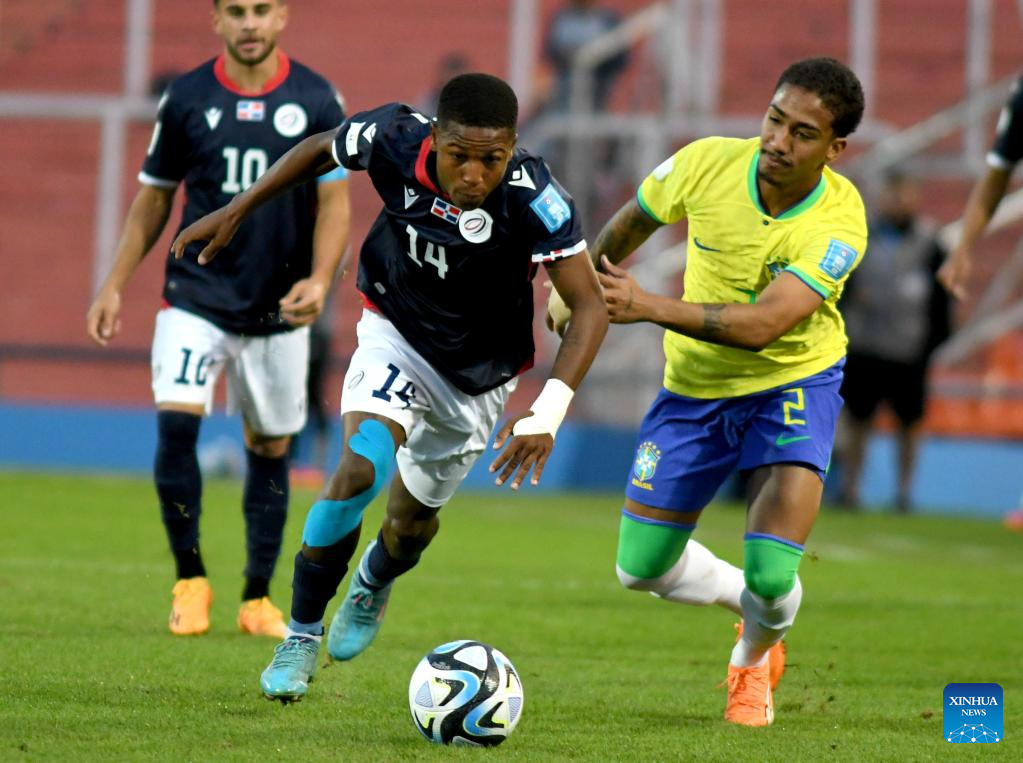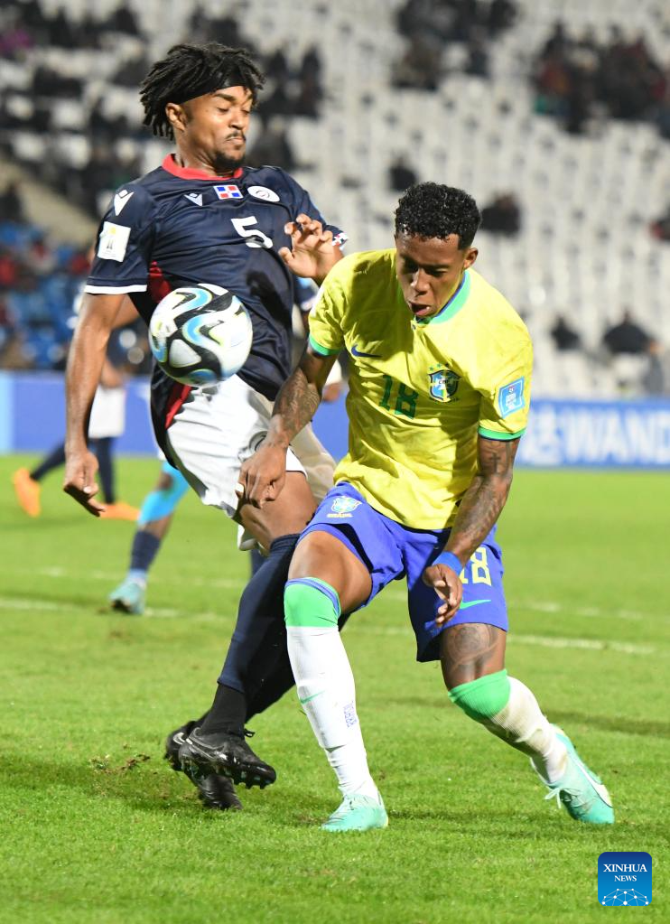 Kevin (R) of Brazil vies with Kleffer Martes of Dominican Republic during the FIFA U20 World Cup group D match between Brazil and Dominican Republic in Mendoza, Argentina, May 24, 2023. (TELAM/Handout via Xinhua)