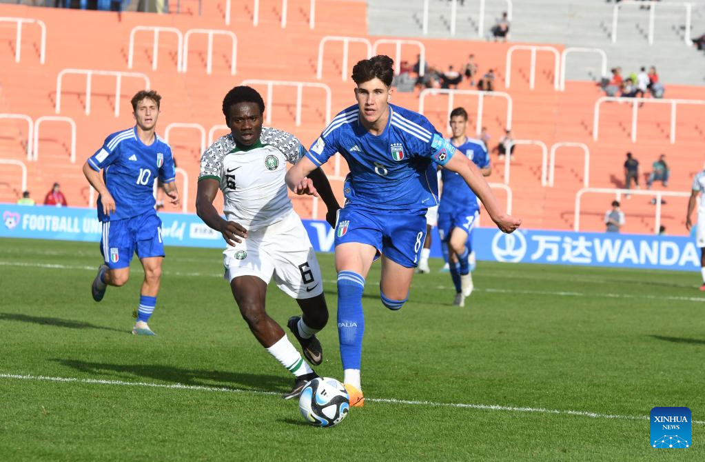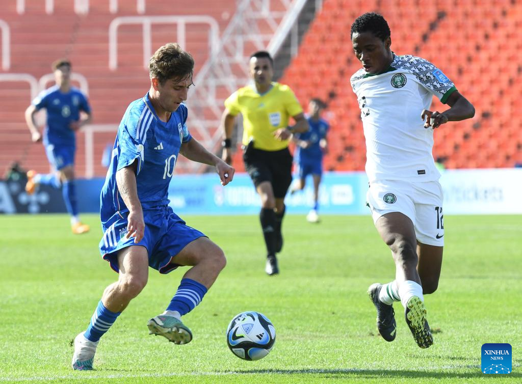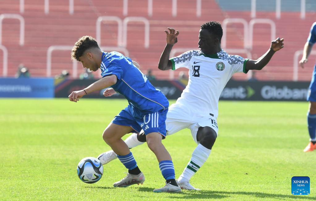 Daniel Bameyi (L) of Nigeria vies with Cesare Casadei of Italy during the FIFA U20 World Cup group D match between Nigeria and Italy in Mendoza, Argentina, May 24, 2023. (TELAM/Handout via Xinhua)