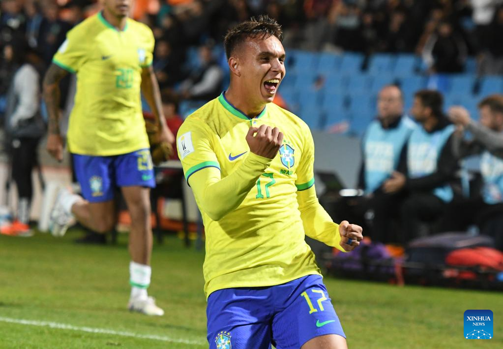 Giovane of Brazil celebrates his goal during the FIFA U20 World Cup group D match between Brazil and Dominican Republic in Mendoza, Argentina, May 24, 2023. (TELAM/Handout via Xinhua)