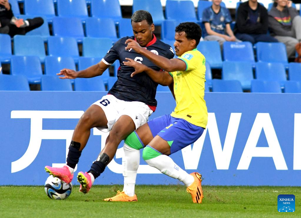 Kaiki (R) of Brazil vies with Israel Boatwright of Dominican Republic during the FIFA U20 World Cup group D match between Brazil and Dominican Republic in Mendoza, Argentina, May 24, 2023. (TELAM/Handout via Xinhua)