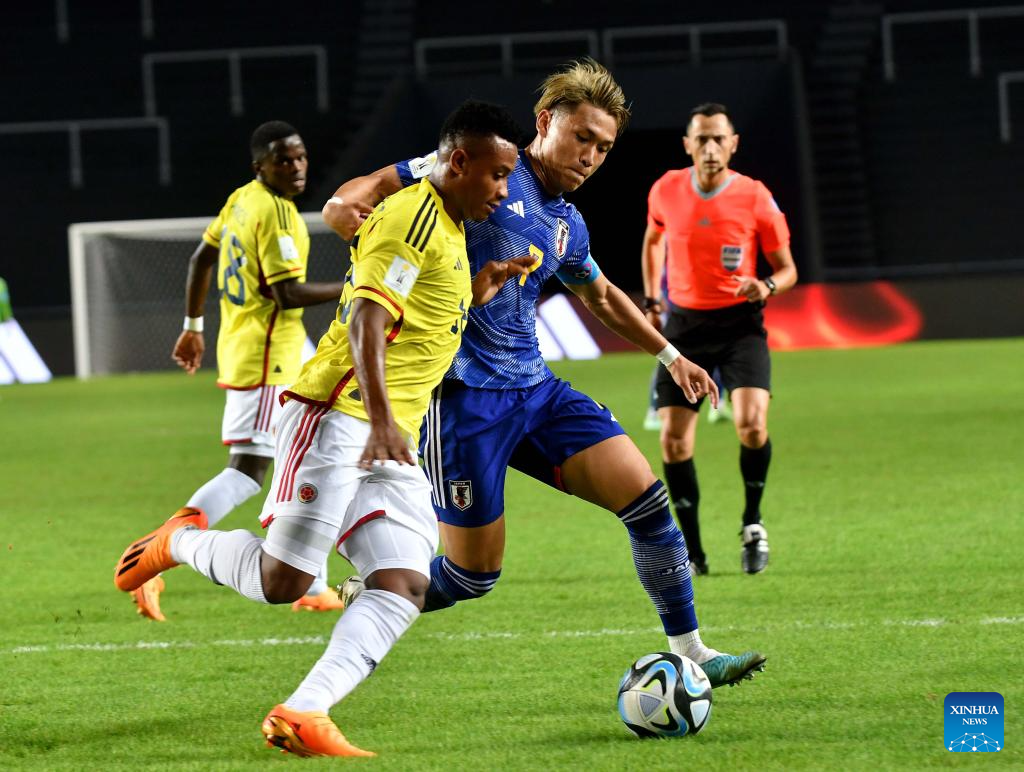 Matsuki Kuryu (2nd R) of Japan vies with Oscar Cortes of Colombia during the FIFA U20 World Cup group C match between Japan and Colombia in La Plata, Argentina, May 24, 2023. (TELAM/Handout via Xinhua)