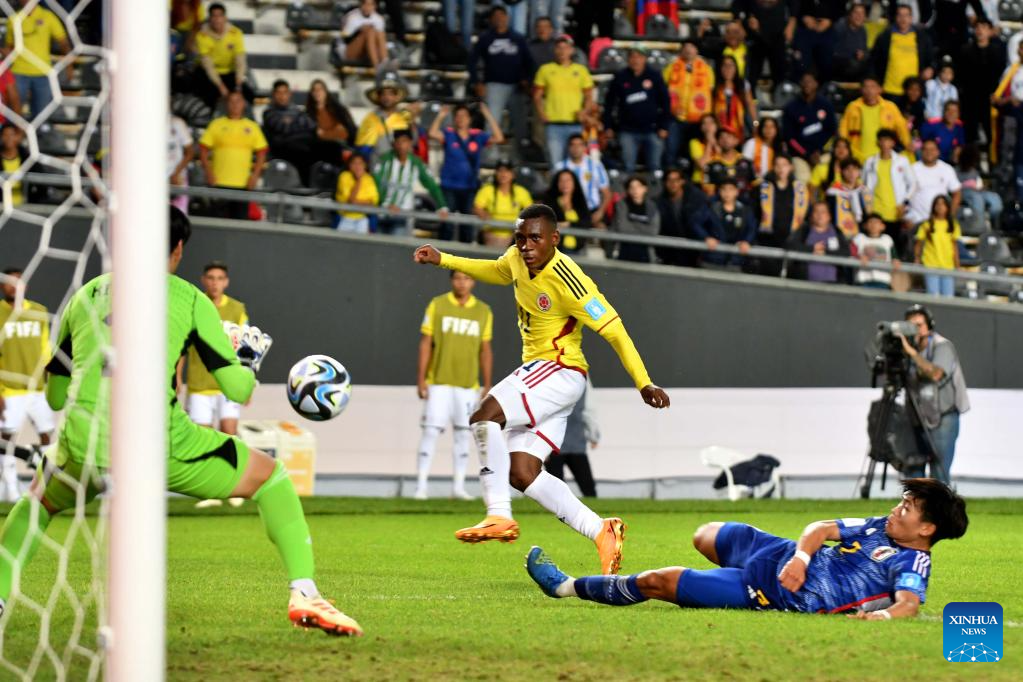 Alexis Manyoma (C) of Colombia shoots during the FIFA U20 World Cup group C match between Japan and Colombia in La Plata, Argentina, May 24, 2023. (TELAM/Handout via Xinhua)