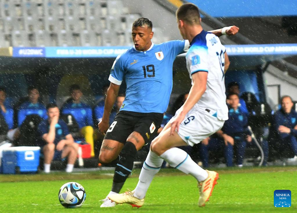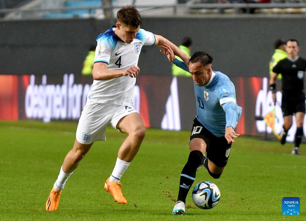 Ronnie Edwards (R) of England vies with Luciano Rodriguez of Uruguay during the FIFA U20 World Cup group E match between England and Uruguay in La Plata, Argentina, May 25, 2023. (TELAM/Handout via Xinhua)