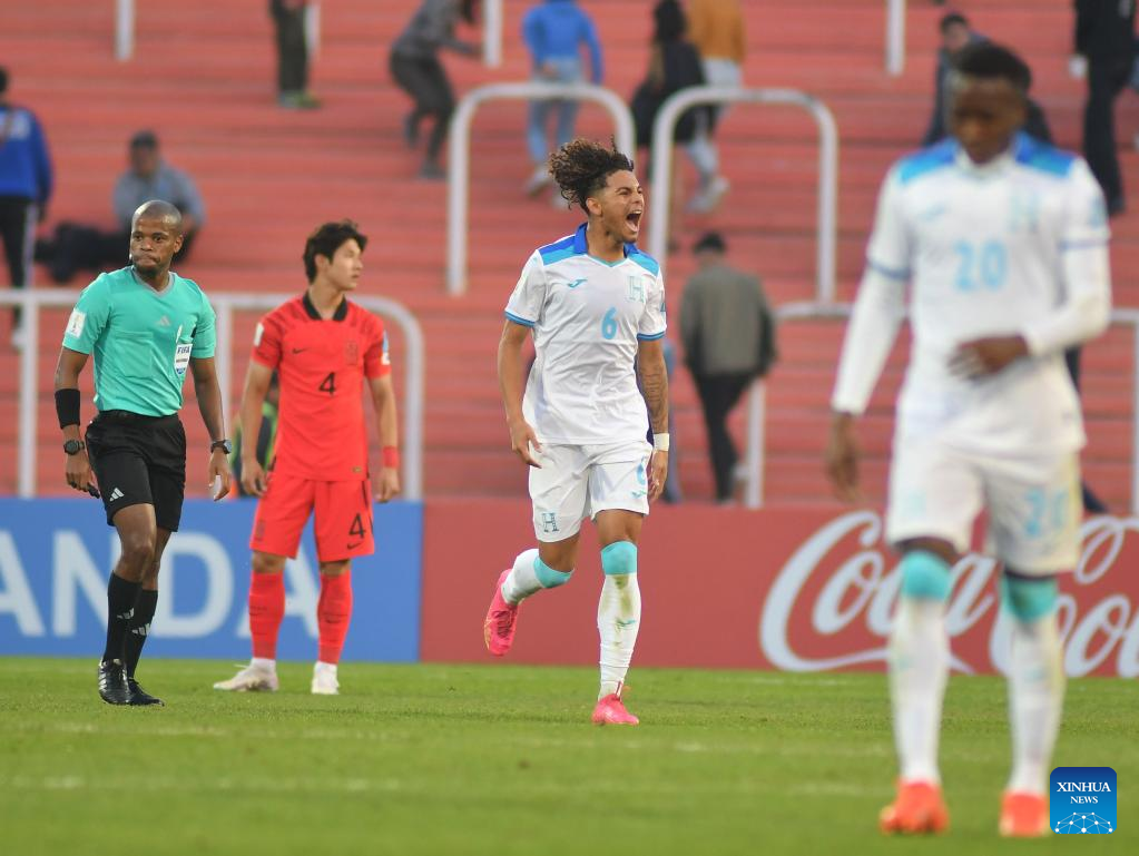 David Ochoa (C) of Honduras celebrates his goal during the FIFA U20 World Cup group F match between South Korea and Honduras in Mendoza, Argentina, May 25, 2023. (TELAM/Handout via Xinhua)