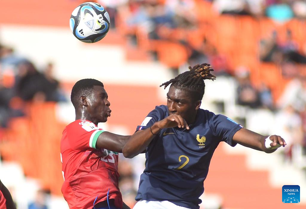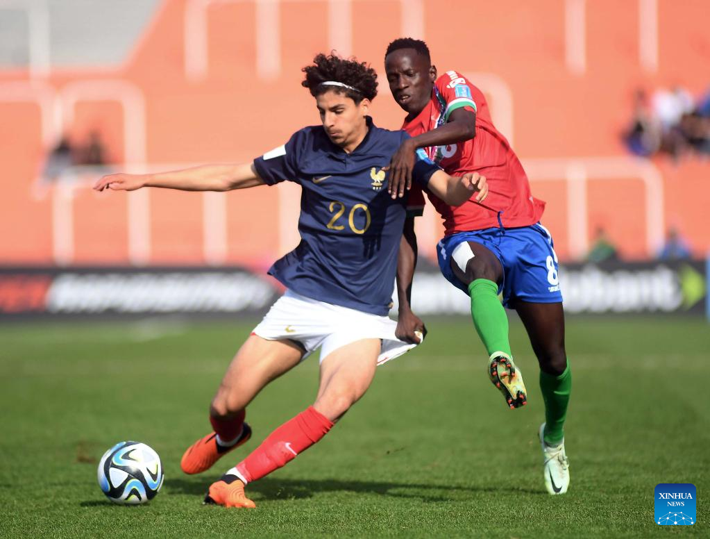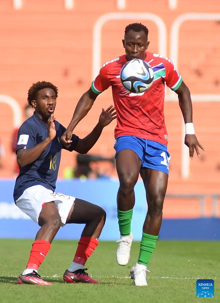 Salifu Colley (R) of Gambia vies with Martin Adeline of France during the FIFA U20 World Cup group F match between France and Gambia in Mendoza, Argentina, May 25, 2023. (TELAM/Handout via Xinhua)