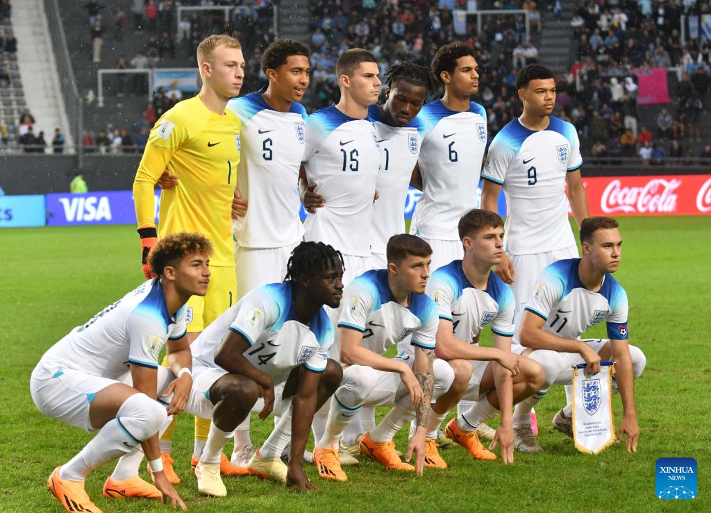 Starting players of England line up prior to the FIFA U20 World Cup group E match between England and Uruguay in La Plata, Argentina, May 25, 2023. (TELAM/Handout via Xinhua)
