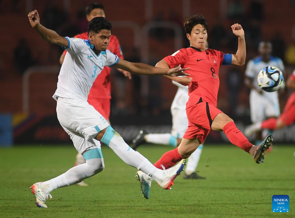 Bae Junho (R) of South Korea vies with Felix Garcia of Honduras during the FIFA U20 World Cup group F match between South Korea and Honduras in Mendoza, Argentina, May 25, 2023. (TELAM/Handout via Xinhua)