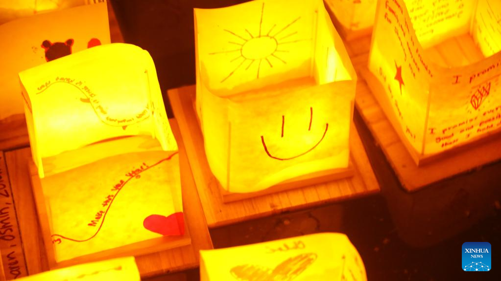 Lanterns float on the water during the Water Lantern Festival held in Houston, Texas, the United States, May 27, 2023. (Xinhua/Xu Jianmei)
