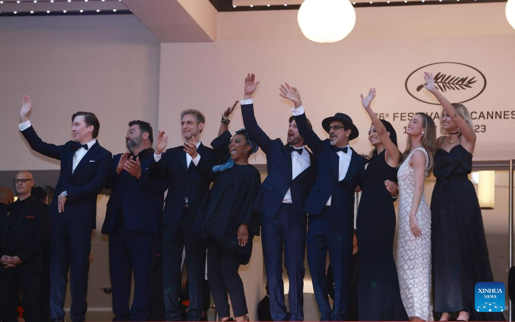Swedish film director and President of the Jury of the 76th Cannes Film Festival Ruben Ostlund (C) and members of the main competition jury arrive for the closing ceremony of the 76th edition of the Cannes Film Festival in Cannes, southern France, May 27, 2023. (Xinhua/Gao Jing)