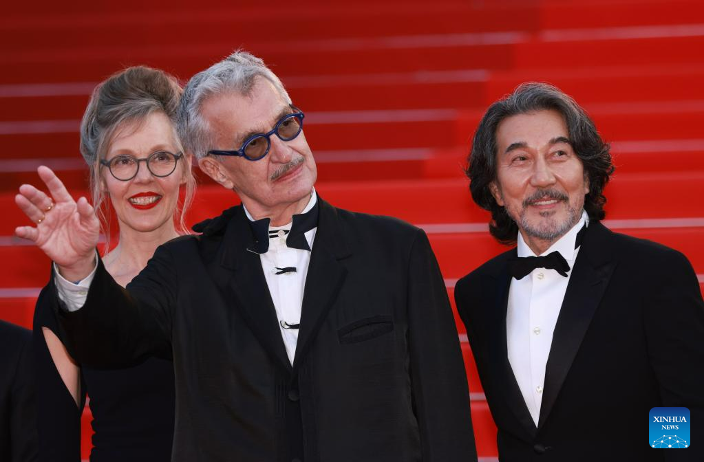 German director Wim Wenders (C) and Japanese actor Koji Yakusho (R) arrive for the closing ceremony of the 76th edition of the Cannes Film Festival in Cannes, southern France, May 27, 2023. (Xinhua/Gao Jing)