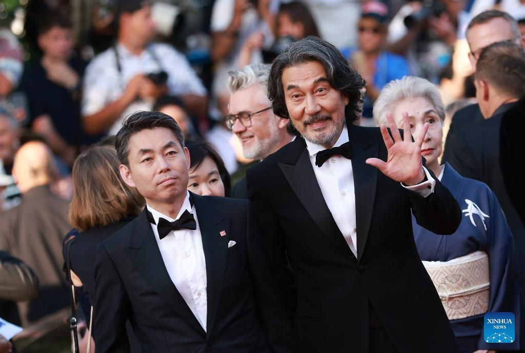 Japanese actor Koji Yakusho (R, front) arrives for the closing ceremony of the 76th edition of the Cannes Film Festival in Cannes, southern France, May 27, 2023. (Xinhua/Gao Jing)