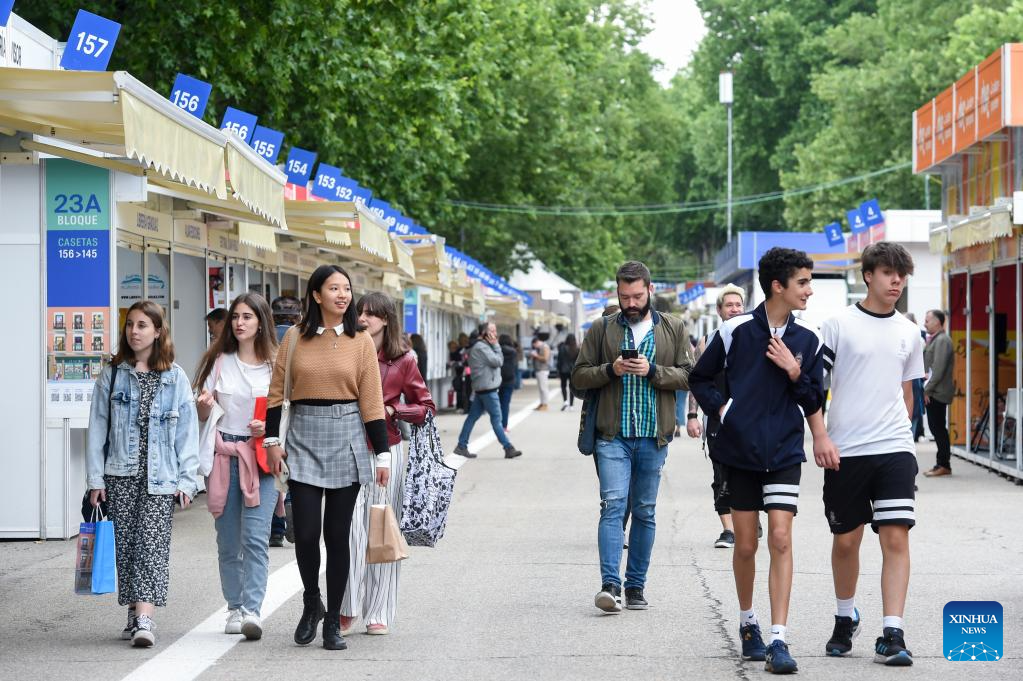 People visit Madrid Book Fair in Madrid, Spain, May 26, 2023. The 82nd edition of Madrid Book Fair is held from May 26 to June 11, 2023 at El Retiro Park in Madrid. (Photo by Gustavo Valiente/Xinhua)