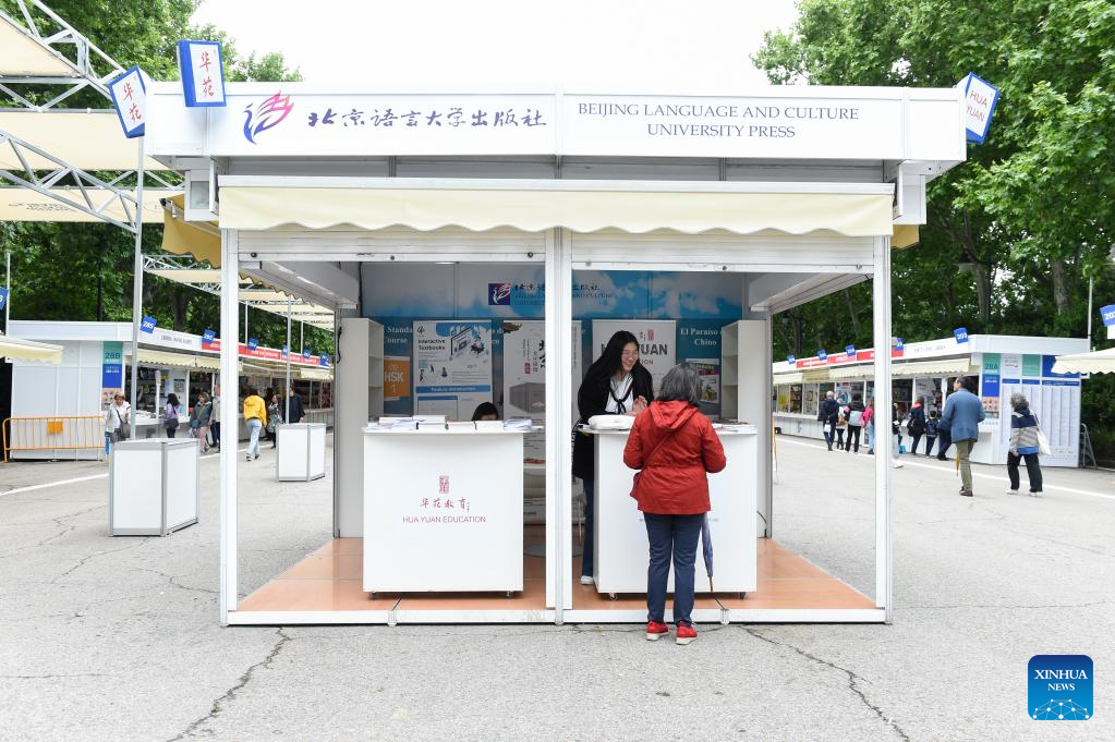 A woman visits the stand of Beijing Language and Culture University Press on Madrid Book Fair in Madrid, Spain, on May 26, 2023. The 82nd edition of Madrid Book Fair is held from May 26 to June 11, 2023 at El Retiro Park in Madrid. (Photo by Gustavo Valiente/Xinhua)