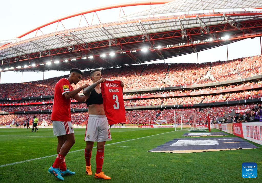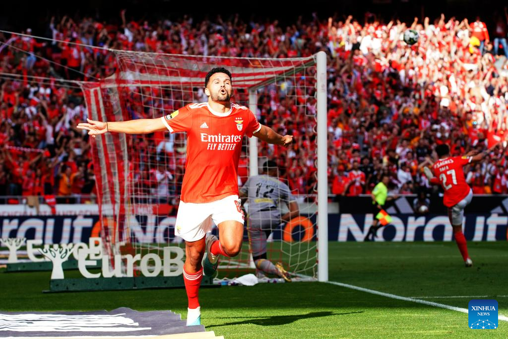 Goncalo Ramos of Benfica celebrates scoring a goal during the Portuguese League football match between SL Benfica and Santa Clara in Lisbon, Portugal, May 27, 2023. (Photo by Pedro Fiuza/Xinhua)