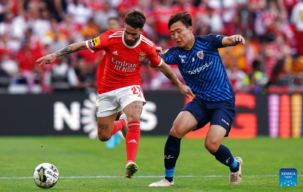 Rafa Silva (L) of Benfica vies with Kento Misao of Santa Clara during the Portuguese League football match between SL Benfica and Santa Clara in Lisbon, Portugal, May 27, 2023. (Photo by Pedro Fiuza/Xinhua)