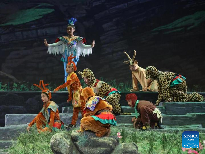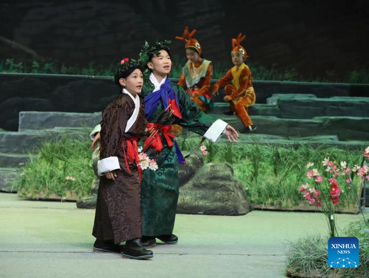 LHASA, June 1 (Xinhua) -- Tenzin Mengnam, a 13-year-old actor dressed in a deep green traditional costume of Tibetan opera, was kneeling on the center stage, holding his unconscious "younger brother." Teary-eyed, the child sang a mournful melody in his low-pitched voice, easily touching the audience's hearts.